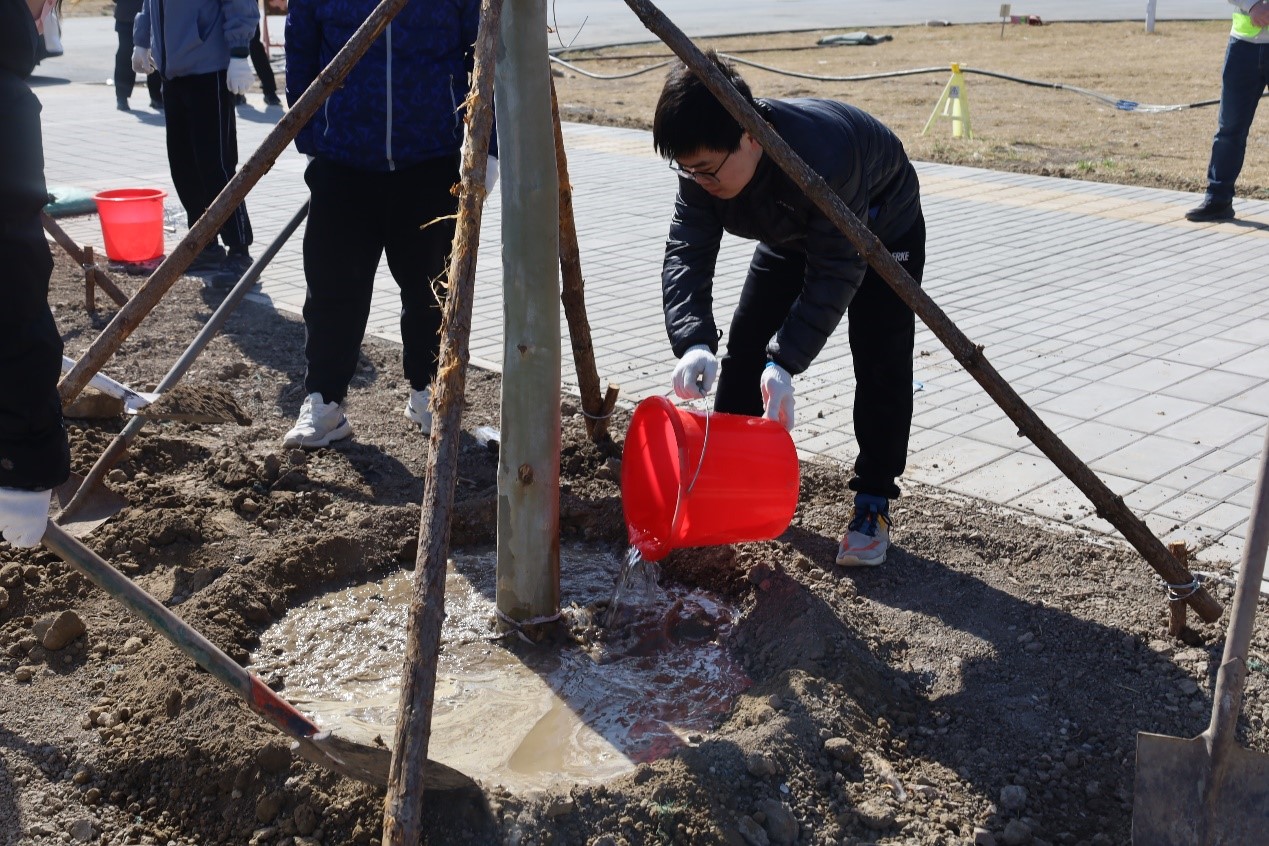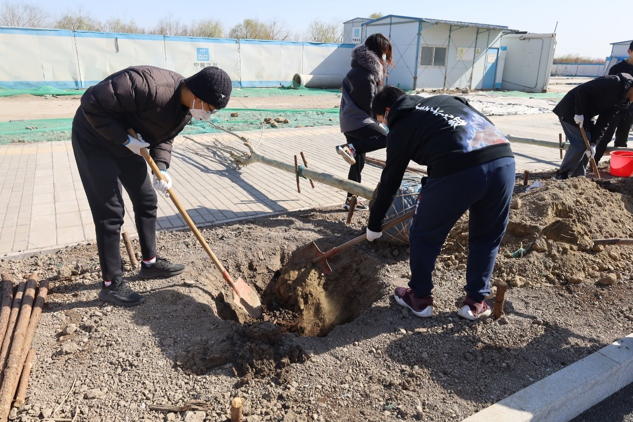 在工作人员的指导下,同学们一起完成挖坑、培土、压实、支护、浇水等步骤。在种植过程中,互相配合、相互鼓励、充满热情。