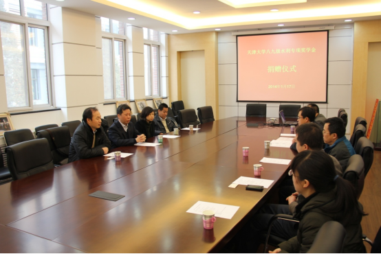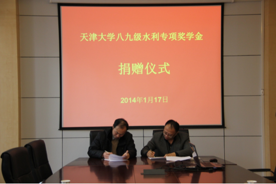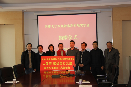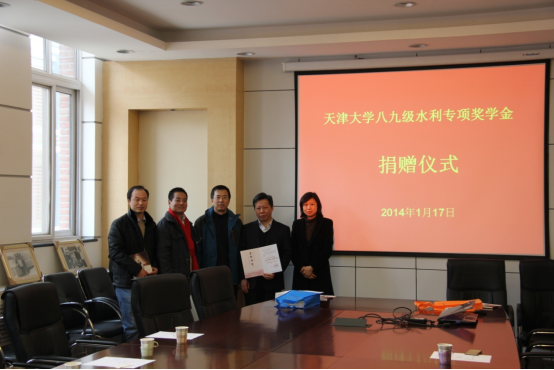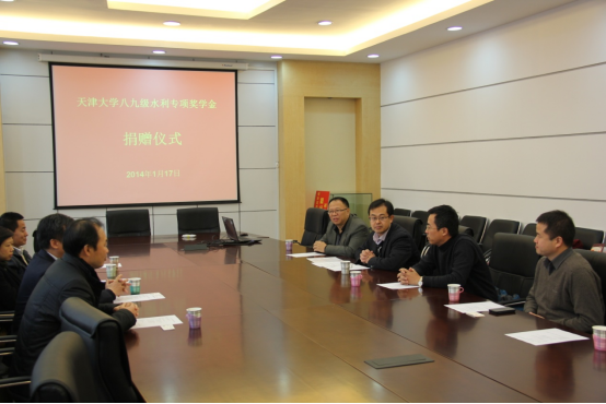 1月17日的上午10:30,在天津大学建工学院第四教学楼的会议室里谈笑风生、气氛融洽,89级水利系的三位校友代表所有热心关注学院发展的同学们捐赠了25万元人民币设立了八九水利专项奖学金,专门为水利系品学兼优、家境贫寒的新生提供助学资金。