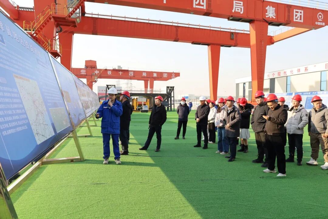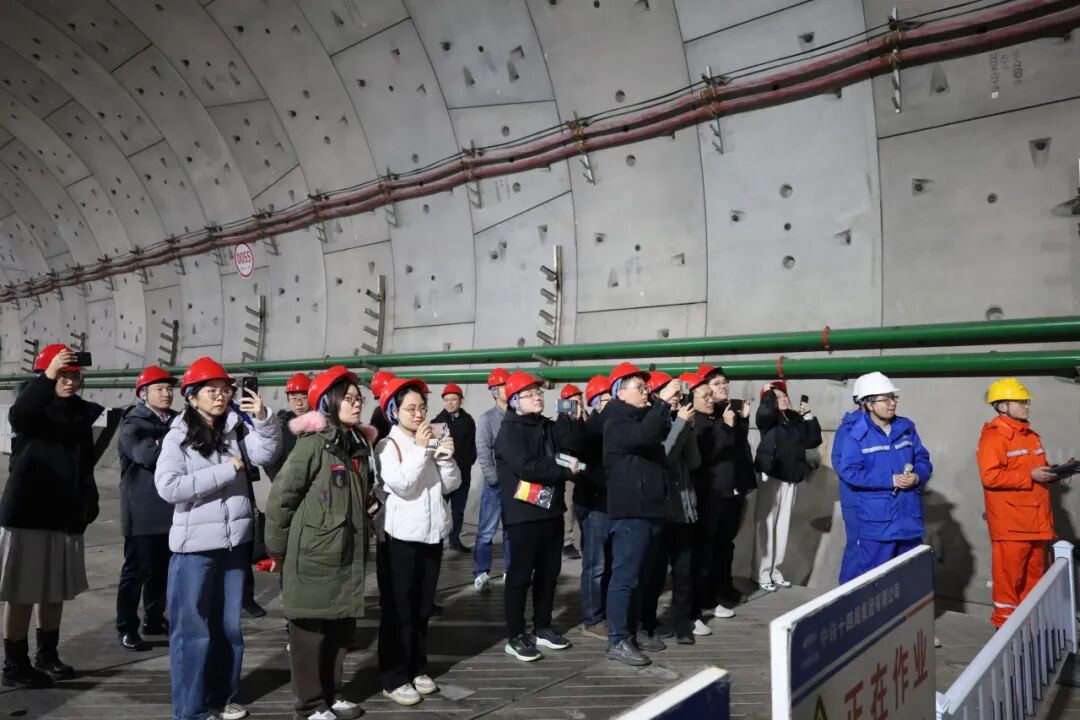 在京滨铁路天津机场2号隧道,实践团重点参观了中铁十四局京滨铁路五标项目现场。该隧道作为京滨铁路全线重点控制性工程,采用全预制装配式盾构技术,成功破解传统施工模式下环境扰动大、质量管控难等痛点,是“轨道上的京津冀”建设的重要支撑工程。项目讲解员系统介绍了工程建设总体情况及核心创新成果,重点演示了预制沟槽拼装技术与整体式轨下结构精调技术的应用流程与实践成效。实践团认真听取讲解,近距离观摩施工工艺,围绕关键问题与项目技术团队深入研讨,进一步深化了对大型交通工程绿色建造、智能建造理念的理解。