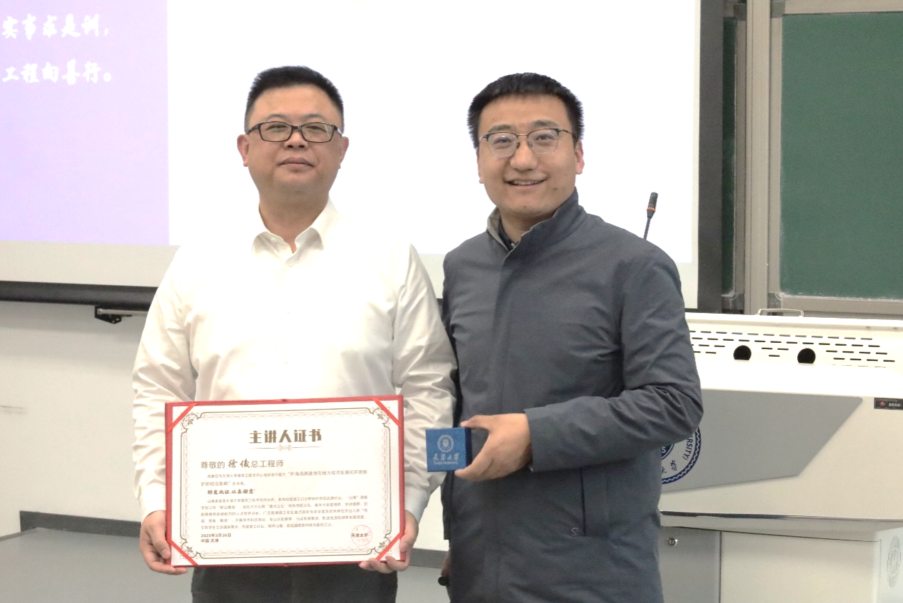 随后,徐俊总工程师做了题为“外海岛礁建港的工程伦理思考——港口工程设计与多维度价值平衡”的精彩报告。他通过详实的亲身实践案例分析,系统阐释了外海岛礁建港工程的战略背景、技术特征及面临的伦理挑战。他以工程建设与当地社区权益冲突、生态保护与工程开发矛盾等典型案例为切入点,深入剖析了工程实践中经济效益、社会责任与生态价值的辩证关系,并分享了生态补偿机制、新型桶式基础结构技术等创新解决方案,结合实际工程案例,为建筑工程学院研究生讲授了国家重大工程建设中的伦理问题。报告中,徐俊总工程师结合从业多年的工程实践感悟,以“千秋邈矣留鬼斧,百战归来再读书;三问实事求是训,一生工程向善行”的箴言寄语青年学子,强调工程师应秉持工程向善的初心,在工程全生命周期中践行可持续发展理念。在互动环节,主讲人针对利益相关者参与、港口工程建设难点、结构防灾减灾、建筑工程师如何秉持初心等问题与现场师生进行了充分交流,与会师生纷纷表示受益匪浅,收获颇丰。最后,黄晓伟老师作为学校代表,为徐俊总工程师颁发了主讲人证书和专门订制的“工程师之戒”。